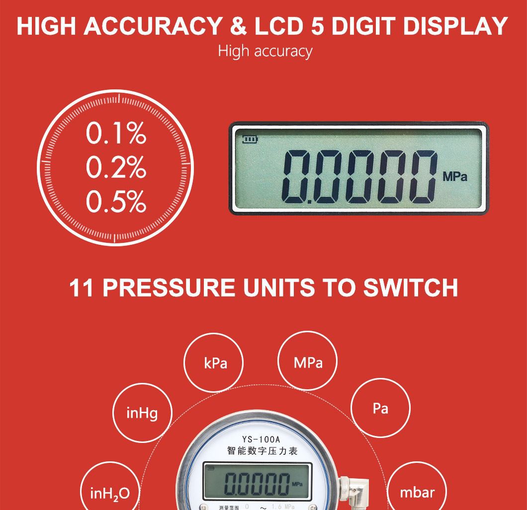 El manòmetre de pressió digital YS-100 és el producte patentat recentment per Hongqi instrument CO.Ltd. Completament estructurat electrònicament, el PG digital adopta un processador de CPU nord-americà de 16 dígits, amb la capacitat d'un súper anti-interferència i un mostreig molt ràpid. La programació adopta la tècnica aritmètica de piomt flotant, la tècnica de filtratge digital, la tècnica del gos de vigilància, etc., el sensor adopta cip piezerosistiu de silici americà. El PG digital és un PG intel·ligent, que és altament precís, de funcionament senzill, fiable, durador i autoprotector. Els clients poden estar segurs d'utilitzar.