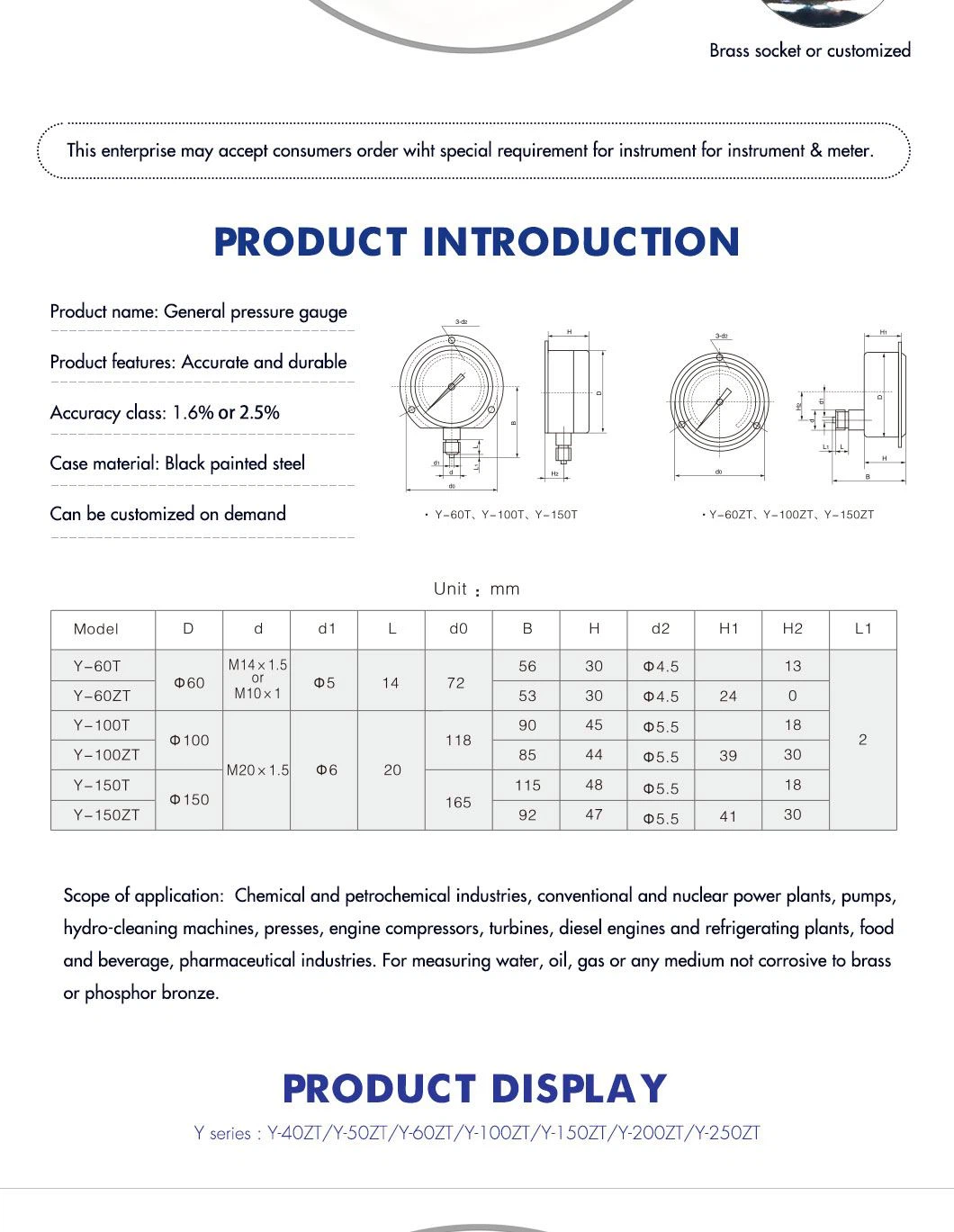 El manòmetre es pot aplicar per a aquells medis gasosos, líquids o vaporosos que no exploten, cristal·litzen i congelen, i corroeixen el coure inoxidable o l'aliatge de coure. Adopta una caixa helicoïdal, un connector de coure estandarditzat, un tub bourdon ampliat, un moviment d'acer inoxidable i un enllaç reforçat. Per tal de garantir la classe de precisió, s'utilitzen equips i tècniques avançades en el procés de calibratge i prova. Es caracteritza per un bon aspecte, alta precisió, petita distància després de tocar, bona repetició i llarga vida útil. Hongqi Instrument (Changxing) Co., Itd ha posat en funcionament. Gràcies als esforços de 15 oficines i més de 100 agents, els nostres productes són populars a tot el país i s'exporten a més de 10 països i regions de l'Orient Mitjà i euroamericans. L'any 2000, vam ser reconeguts com a nom d'empresa sense divisions administratives per l'administració estatal per a la indústria i el comerç, i podem fer negocis d'importació i exportació.